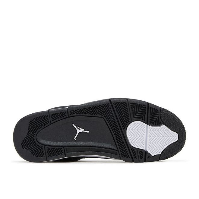 The Air Jordan 4 Retro 'White Thunder' rocks a black suede upper with complementing white touches on the eyelets and quarter panel. Matching white Jumpman logos embellish the tongue tag and heel. A white foam midsole equips a visible Air-sole heel unit, anchored by a herringbone-pattern rubber outsole. Experience something new today.