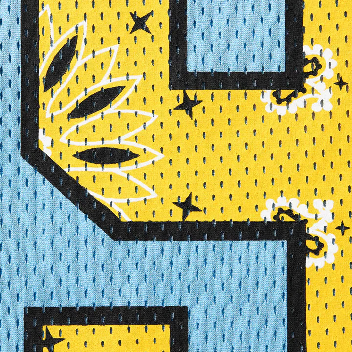 SS25 White -Poly eyelet mesh jersey with printed graphic and logo on front and back. Athletic label at lower front.